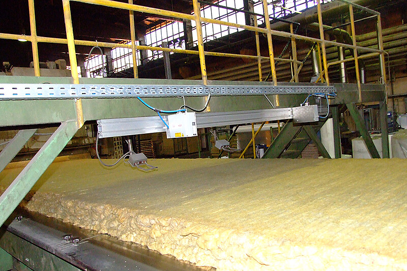 Materiaalin tasalaatuisuuden lisäksi paksuus on tärkeä laatutekijä mineraalivillan eristävien ominaisuuksien kannalta. Tuotantolinjan lopussa rullat leikataan ja jyrsitään vakiopaksuuteen. Tuotannon optimoimiseksi ja hävikin vähentämiseksi materiaalin paksuus mitataan kahdella mittauspisteellä ennen jyrsintä. Näin esipaksuus voidaan optimoida ilman, että se vaikuttaa lopputulokseen. Paksuuden mittaukseen käytetään kahta optoNCDT-laseranturia. Jos turvallisuussyistä on ylläpidettävä pidempiä etäisyyksiä, käytetään optoNCDT ILR2250 -laseretäisyysantureita. Paksuus lasketaan mineraalivillan sekä anturin ja tuen välisen etäisyyden perusteella. Tämän jälkeen mitatut tiedot välitetään ohjausjärjestelmälle.